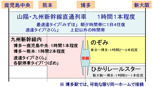 「みずほ」の運行を、この4本と別にするのか、時間帯によって「さくら」に代えるのか、などは未定。山陽新幹線と直通しない博多~鹿児島中央の急行タイプも「さくら」の名前で運行する可能性もある。博多~熊本、博多~鹿児島中央の「つばめ」は各駅停車のみとする方向。