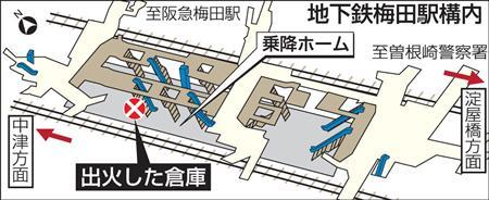 大阪府警曽根崎警察署などによると、倉庫は床面積約30平方メートルでほぼ全焼。ホーム北側のエスカレーターの下にあり、掃除用具や収集されたごみが保管されている。清掃の委託業者が管理しているが、通常は鍵がかかっているという。曽根崎警察署が施錠状況や出火原因を調べている。